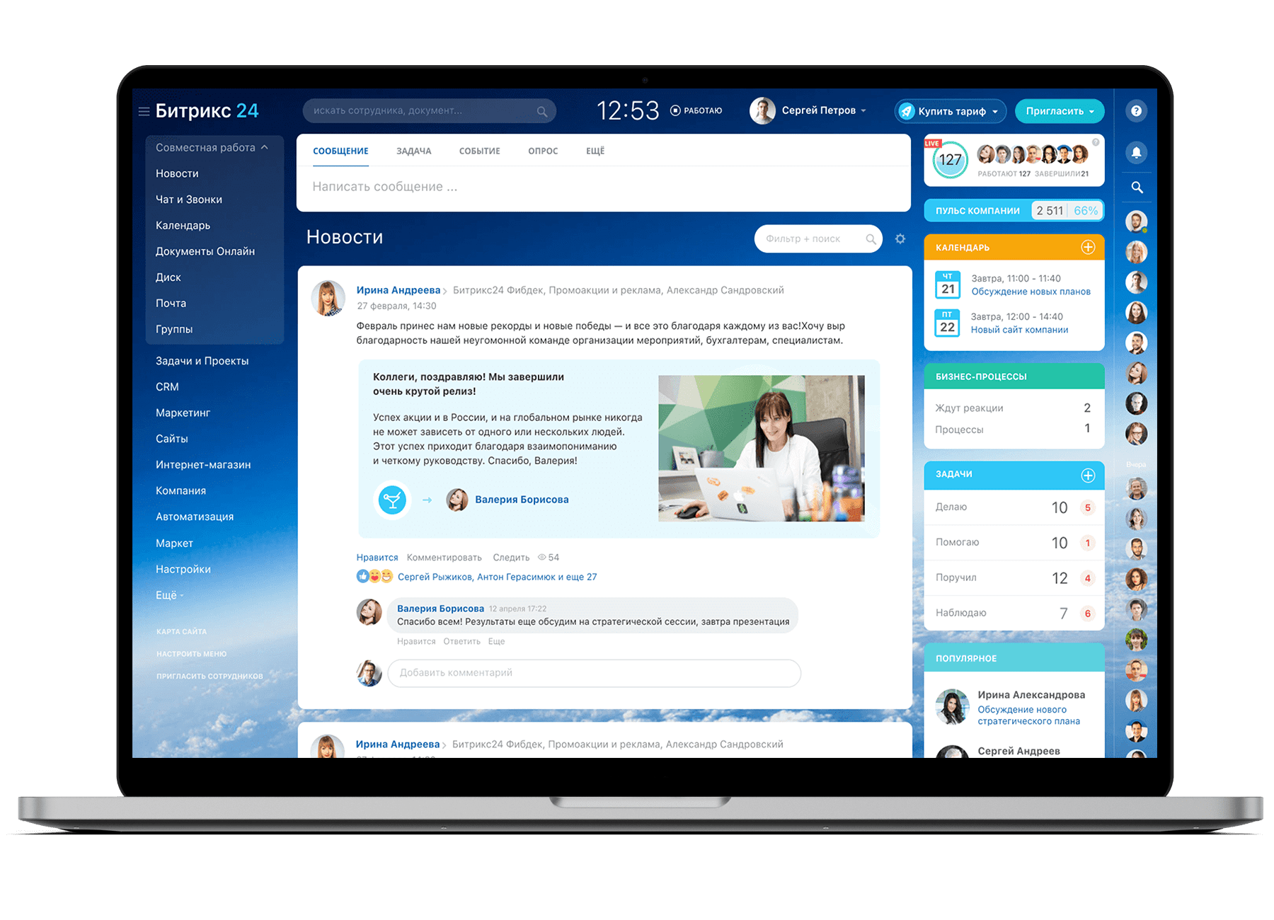 Битрикс24 – виртуальный офис вашей компании. Здесь вы можете общаться, планировать, выполнять задачи и проекты, делиться информацией –