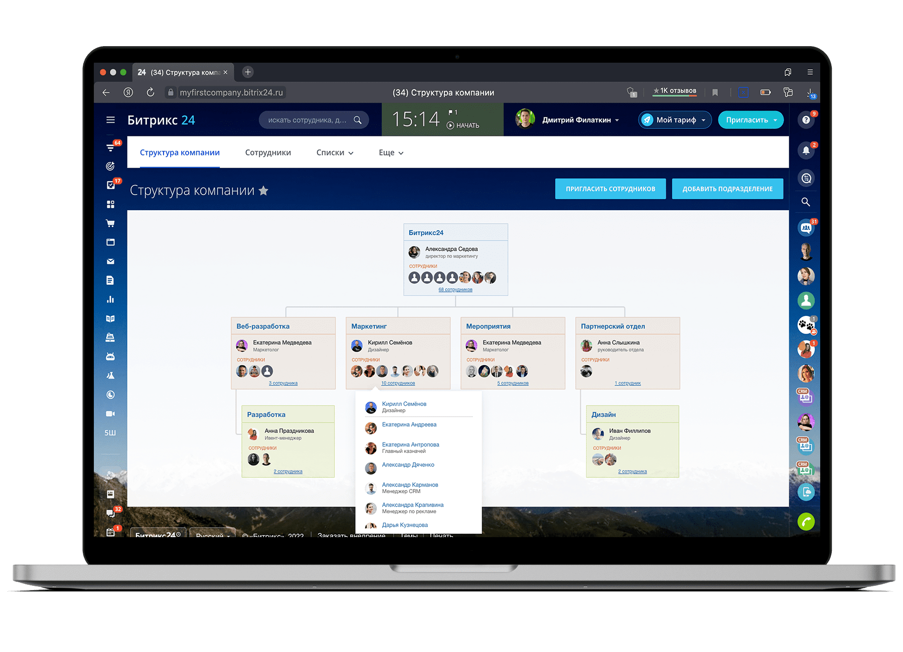 В Битрикс24 отображается структура вашей компании со всеми подразделениями и отделами. Вы легко сможете выстроить иерархию, настроить права доступа, найти нужного сотрудника