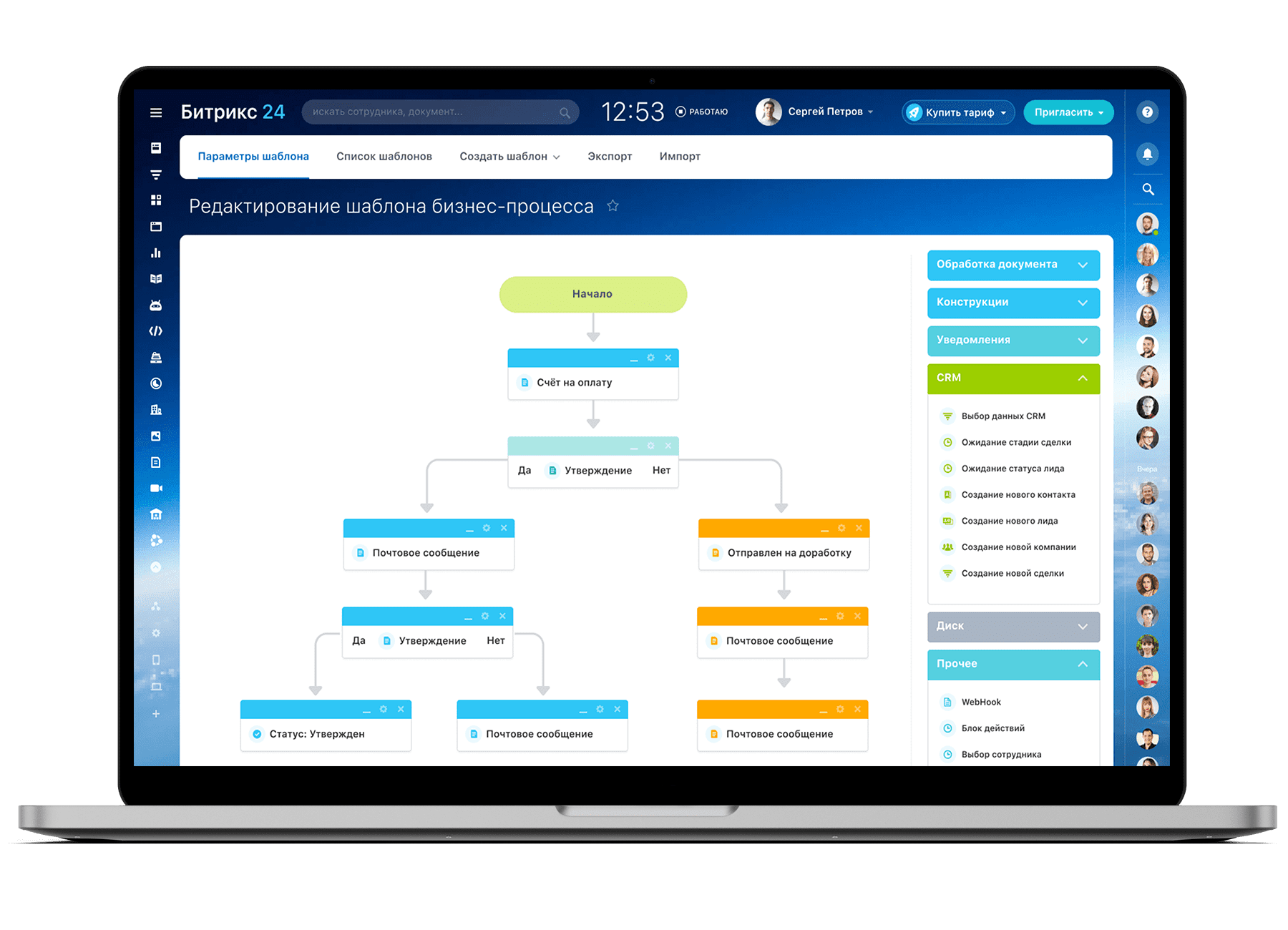 Бизнес-процессы ускорят согласование внутри компании: счета, отпуска, командировки будут автоматически направлены по заданной цепочке к нужным сотрудникам.